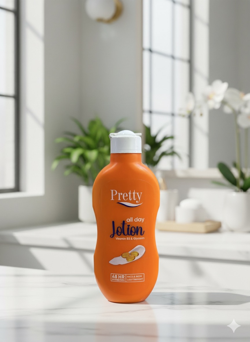 * Name: The brand and product name, “Pretty all day Lotion,” is clearly visible at the top.